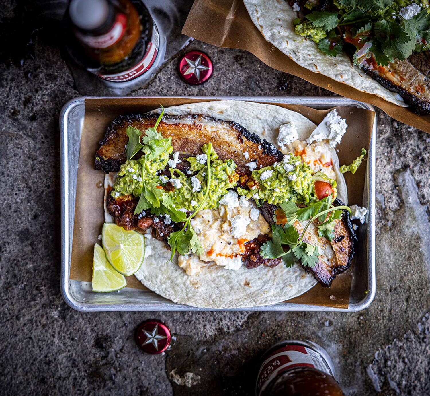 Rosta/stek tortillabröden och håll dem varma mellan handdukar alt i en tortillavärmare. Grilla Spicy Bacon till fin färg och bygg sen ihop din taco som du vill ha den med varma Mushy Beans, äggröra, peamole, koriander, ost och sen lite Hot Sauce och limeklyftor till.